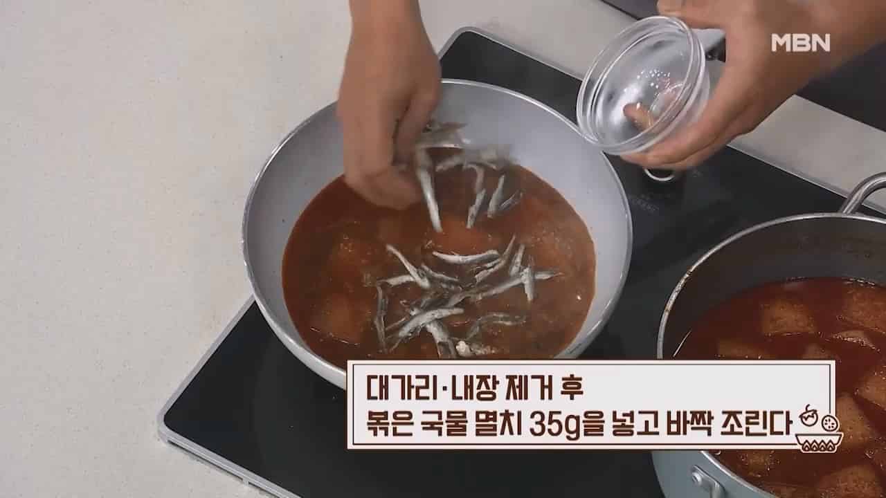 13. 멸치 대가리와 내장을 제거 후 볶은 국물 멸치 35g을 넣고 바짝 조려줍니다.