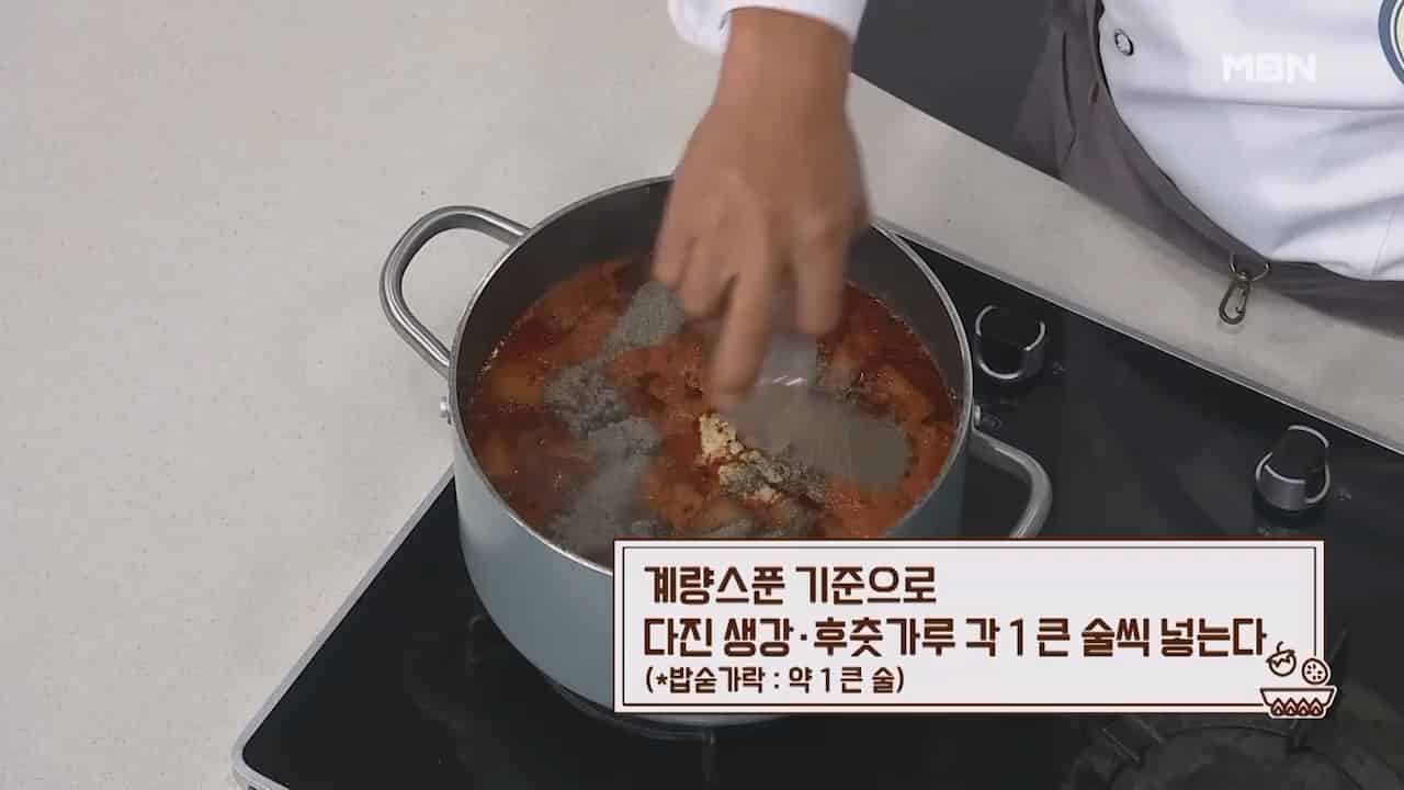 9. 계량스푼 기준으로 다진 생강 1큰술, 후춧가룩 1큰술을 넣습니다. (밥숟가락 약 1큰술)