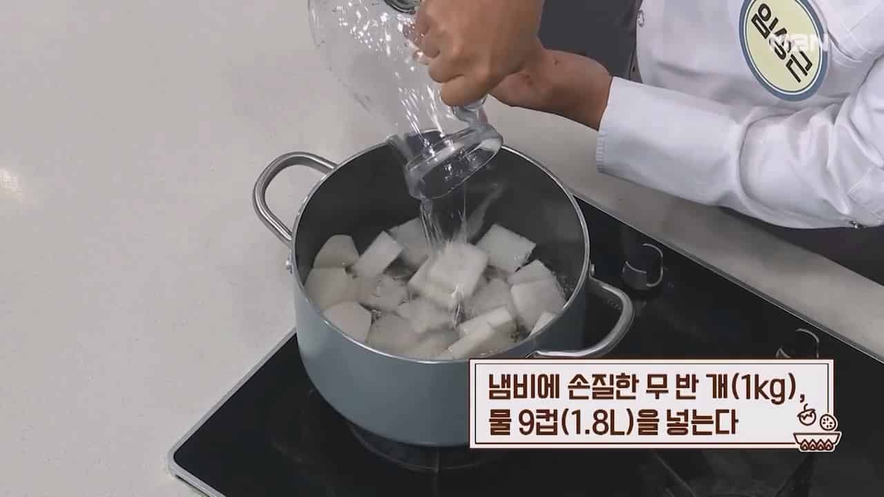 2. 냄비에 손질한 무 반개(1kg), 물 9컵 (1.8리터)을 넣습니다.