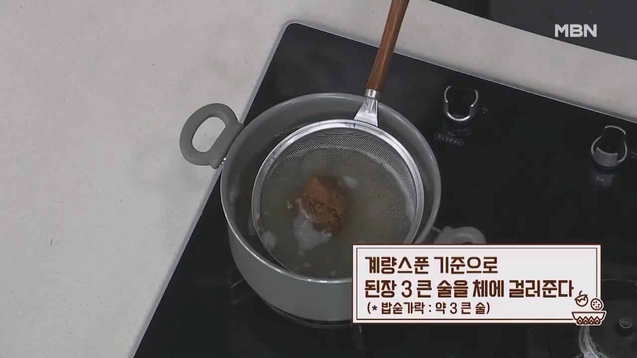 4. 계량스푼 기준으로 된장 3큰술을 체에 걸러주고 새우젓 2큰술을 넣습니다. (밥숟가락 된장 약 3큰술, 새우젓 2큰술)