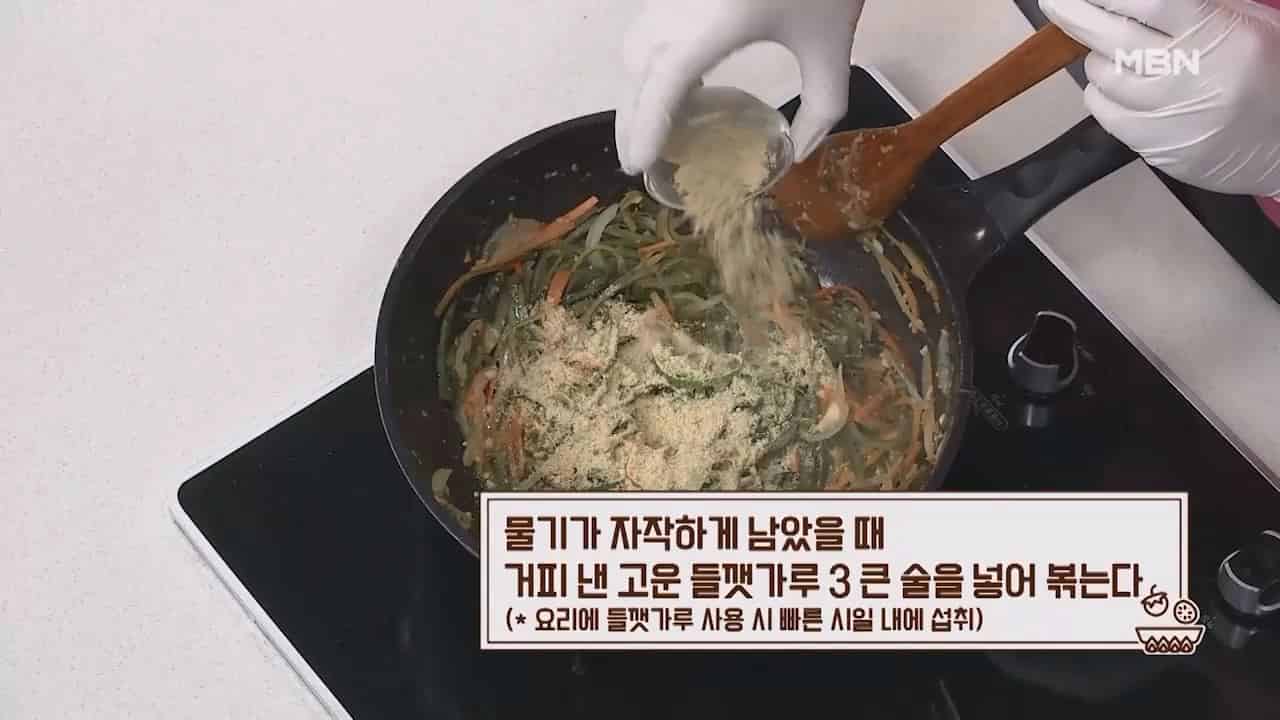 10. 물기가 자작하게 남았을때 거피 낸 고운 들깻가루 3큰술을 넣어 볶아주면 맛있는 미역줄기볶음이 완성됩니다. (요리에 들깻가루 사용시 빠른 시일내에 섭취)