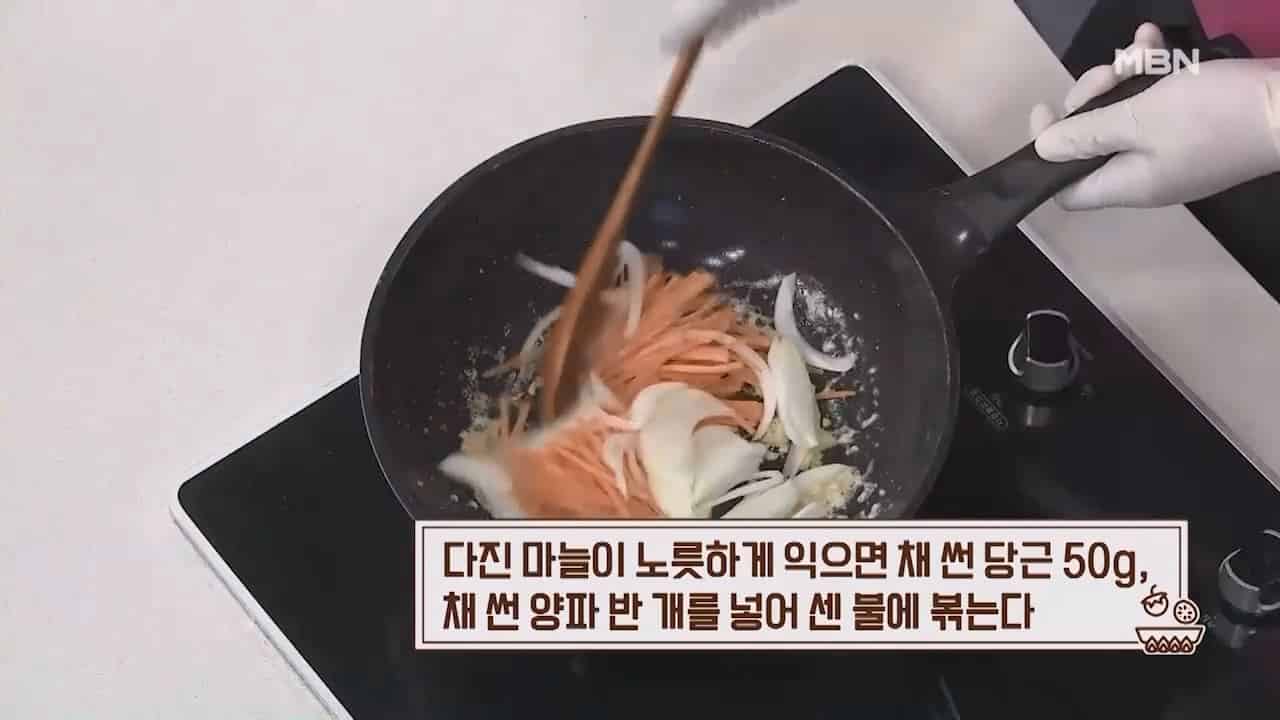 5. 다진 마늘이 노릇하게 익으면 채 썬 당근 50g, 채 썬 양파 반개를 넣어 센 불에 볶아줍니다.