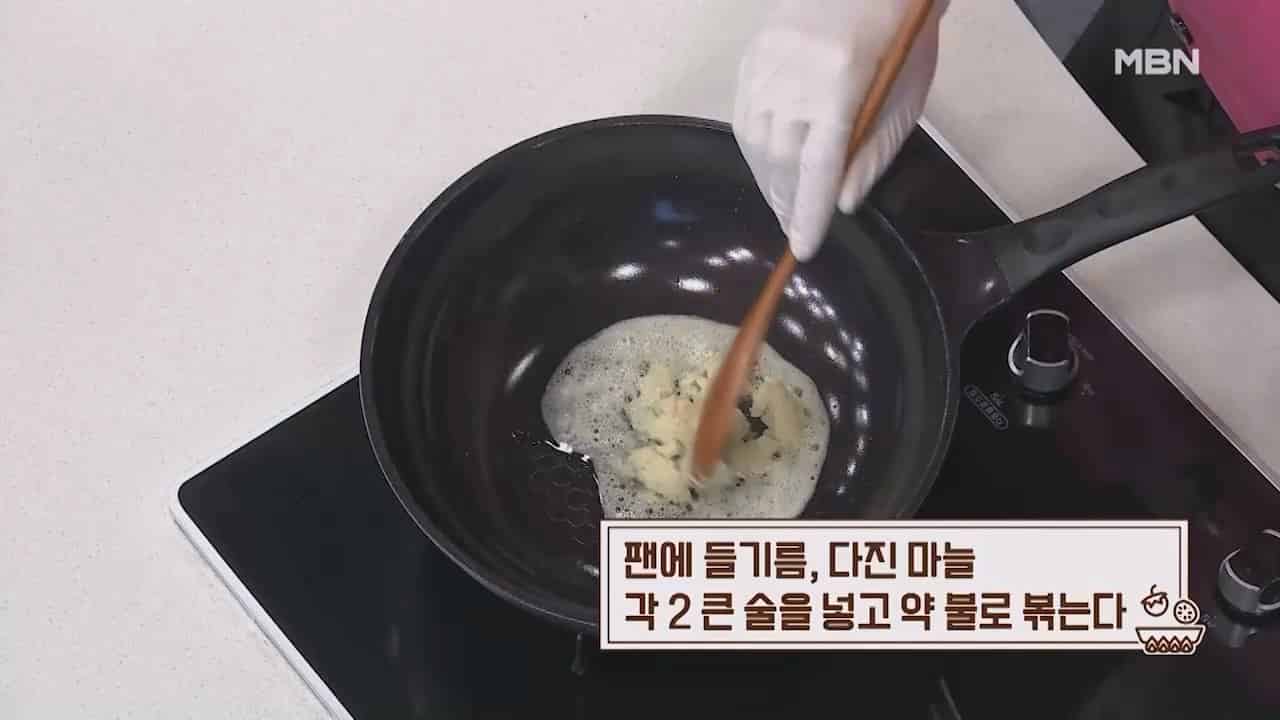 4. 팬에 들기름 2큰술, 다진마늘 2큰술을 넣고 약불로 볶아줍니다.