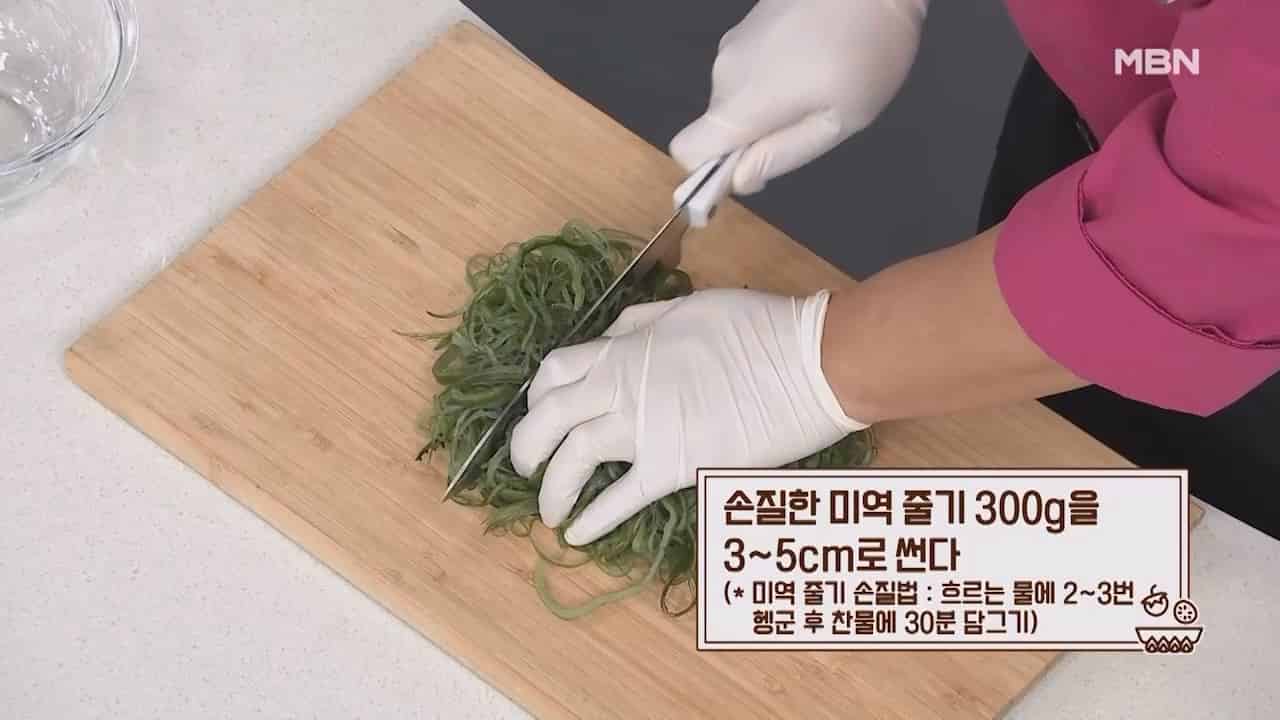 1. 흐르는 물에 2~3번 헹군 후 찬물에 30분 담궈 손질한 미역줄기 300g을 3~5cm로 썰어줍니다.
