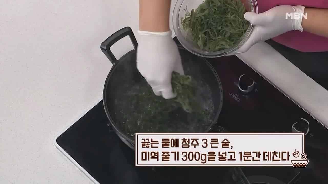 2. 끓는 물에 청주 3큰술, 미역줄기 300g을 넣고 1분간 데쳐줍니다.