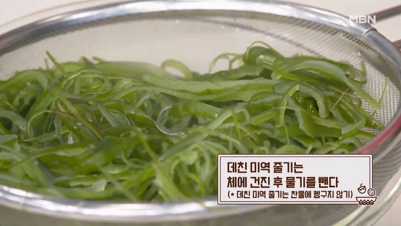 3. 데친 미역줄기는 체에 건진 후 물기를 빼줍니다. (데친 미역줄기는 찬물에 헹구지 않습니다.)