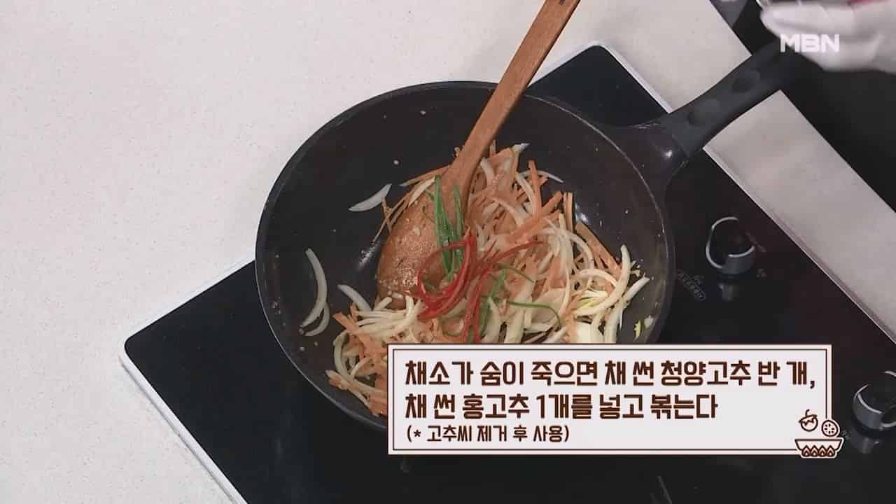 6. 채소가 숨이 죽으면 채 썬 청양고추 반 개, 채 썬 홍고추 1개를 넣고 볶아줍니다. (고추씨 제거 후 사용)