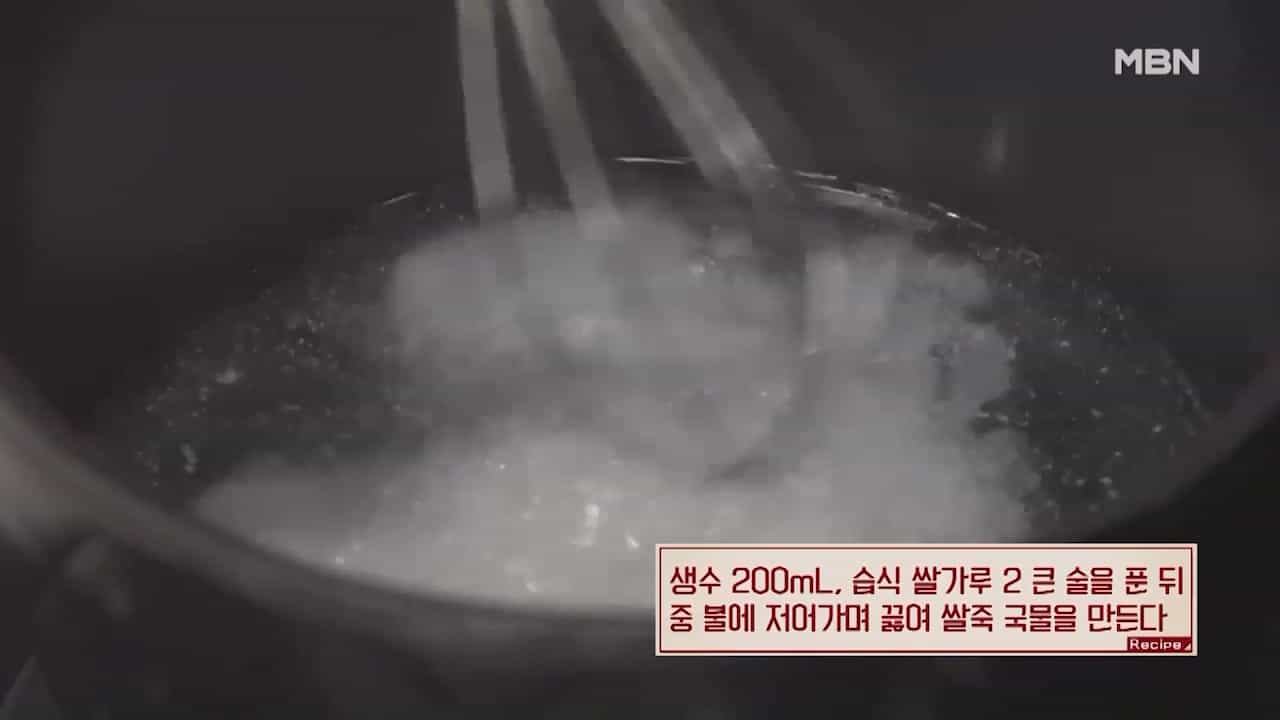 6. 생수 200mL, 습식 쌀가루 2큰술을 푼 뒤 중불에 저어가며 끓여 쌀죽 국물을 만들어 줍니다.