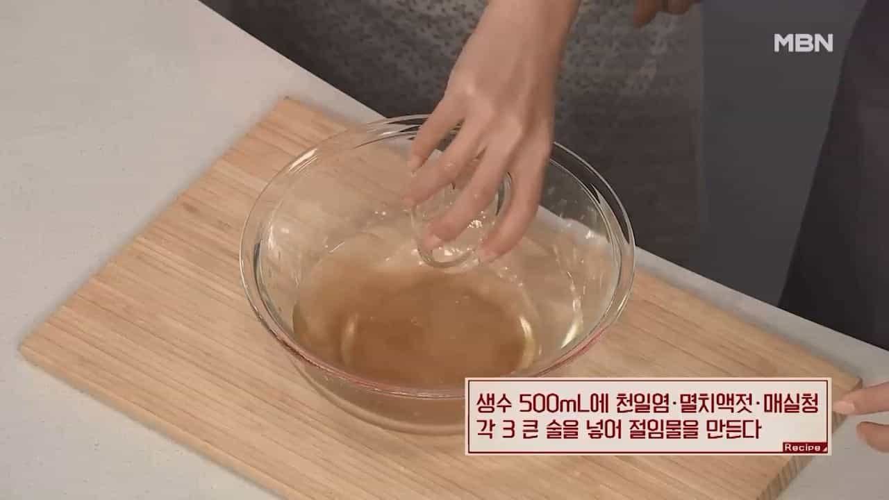3. 생수 500mL에 천일염 3큰술, 멸치액젓 3큰술, 매실청 3큰술을 넣어 절임물을 만듭니다.