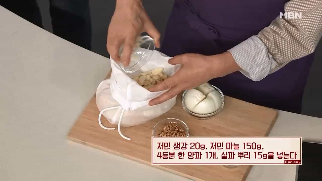 10. 굵게 편 썬 마늘 10개, 채썬 생강 1/2톨을 육수팩에 담습니다.