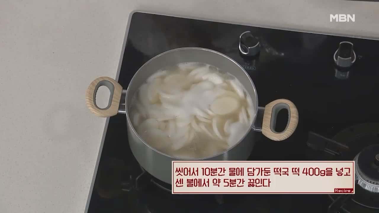 19. 씻어서 10분간 물에 담가둔 떡국 떡 400g을 넣고 센불에서 약 5분간 끓입니다.