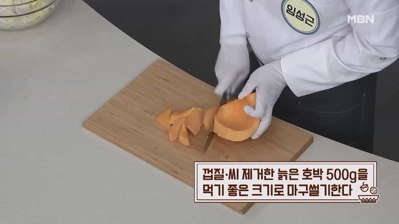 2. 껍질과 씨를 제거한 늙은 호박 500g을 먹기 좋은 크기로 썰어줍니다.