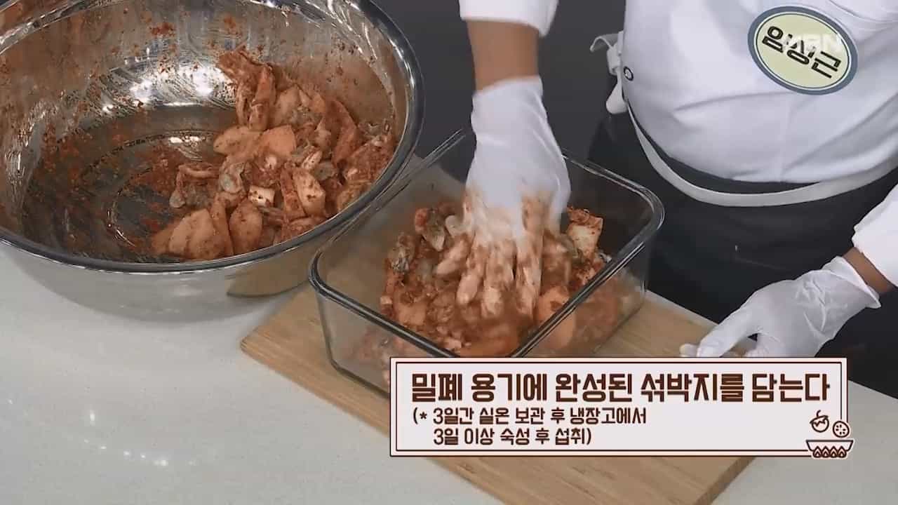 21. 완성된 섞박지를 밀폐용기에 담아 3일간 실온 보관 후 냉장고에서 3일 이상 숙성 후 드시면 맛있는 석박지를 맛볼수 있습니다.