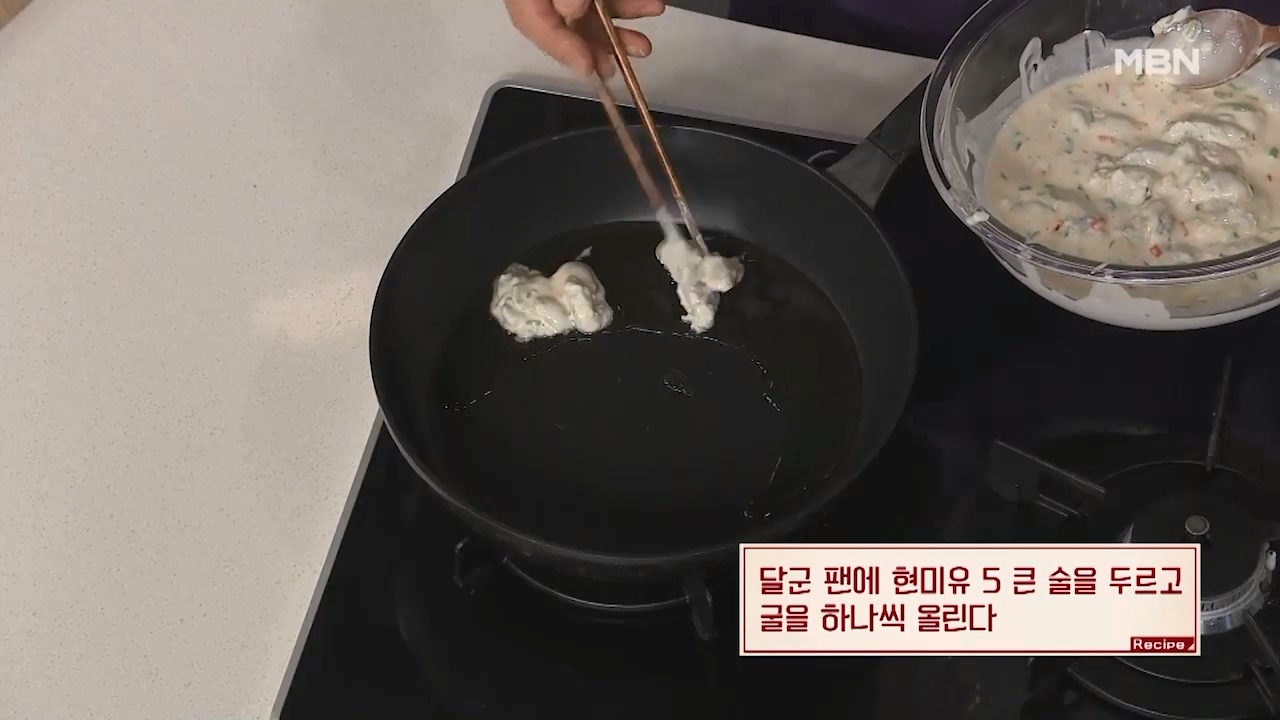 6. 중 불로 달군 팬에 식용유를 넉넉하게 두르고 숟가락으로 굴을 한알씩 떠서 올립니다.