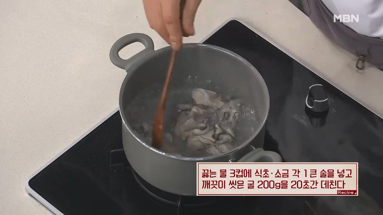 1. 끓는 물 3컵에 식초 1큰술, 소금 1큰술을 넣고 깨끗이 씻은 굴 200g을 20초간 데쳐줍니다.
