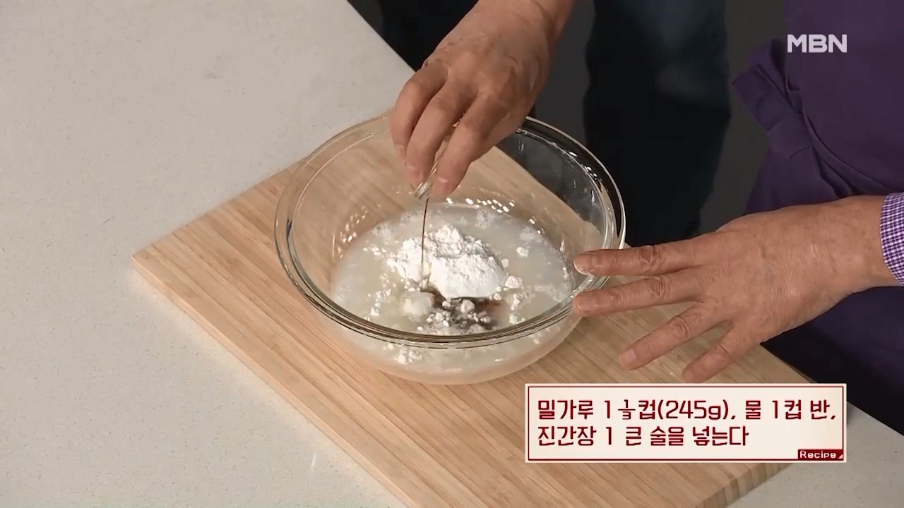 3. 밀가루 1 1/3컵(245g), 물 1컵 반, 진간장 1큰술을 넣고 잘 섞어줍니다.