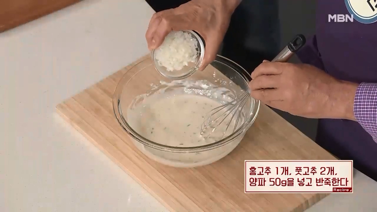 4. 홍고추 1개, 풋고추 2개, 양파 50g을 넣고 잘 섞어 반죽을 합니다.