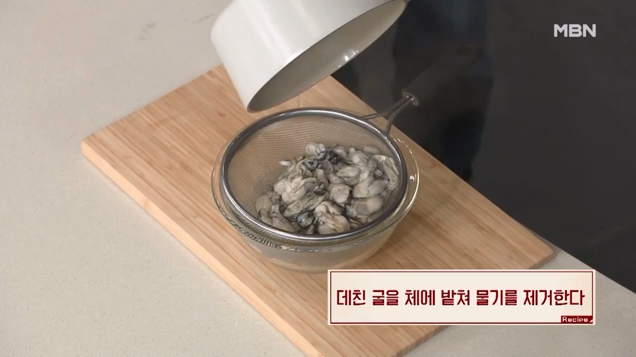 2. 데친 굴을 체에 밭쳐 물기를 제거합니다.