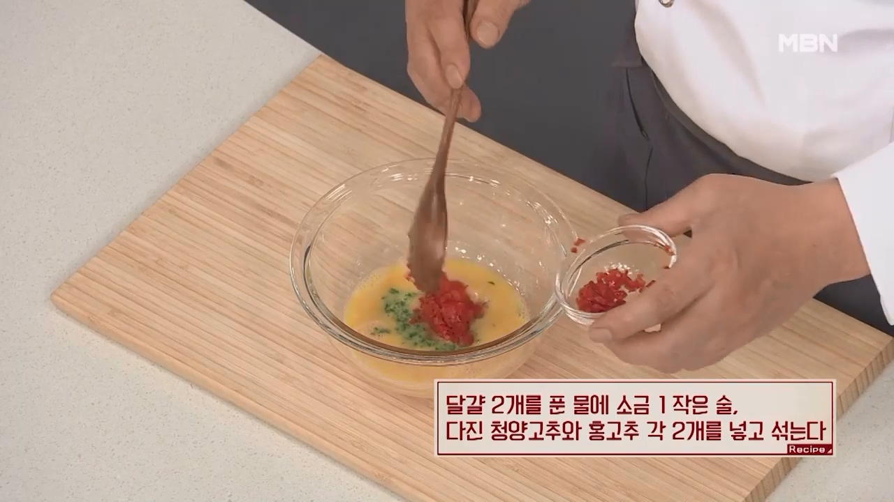 3. 달걀 2개를 푼 물에 소금 1작은술, 다진 청양고추와 홍고추 각 2개를 넣고 잘 섞어줍니다.