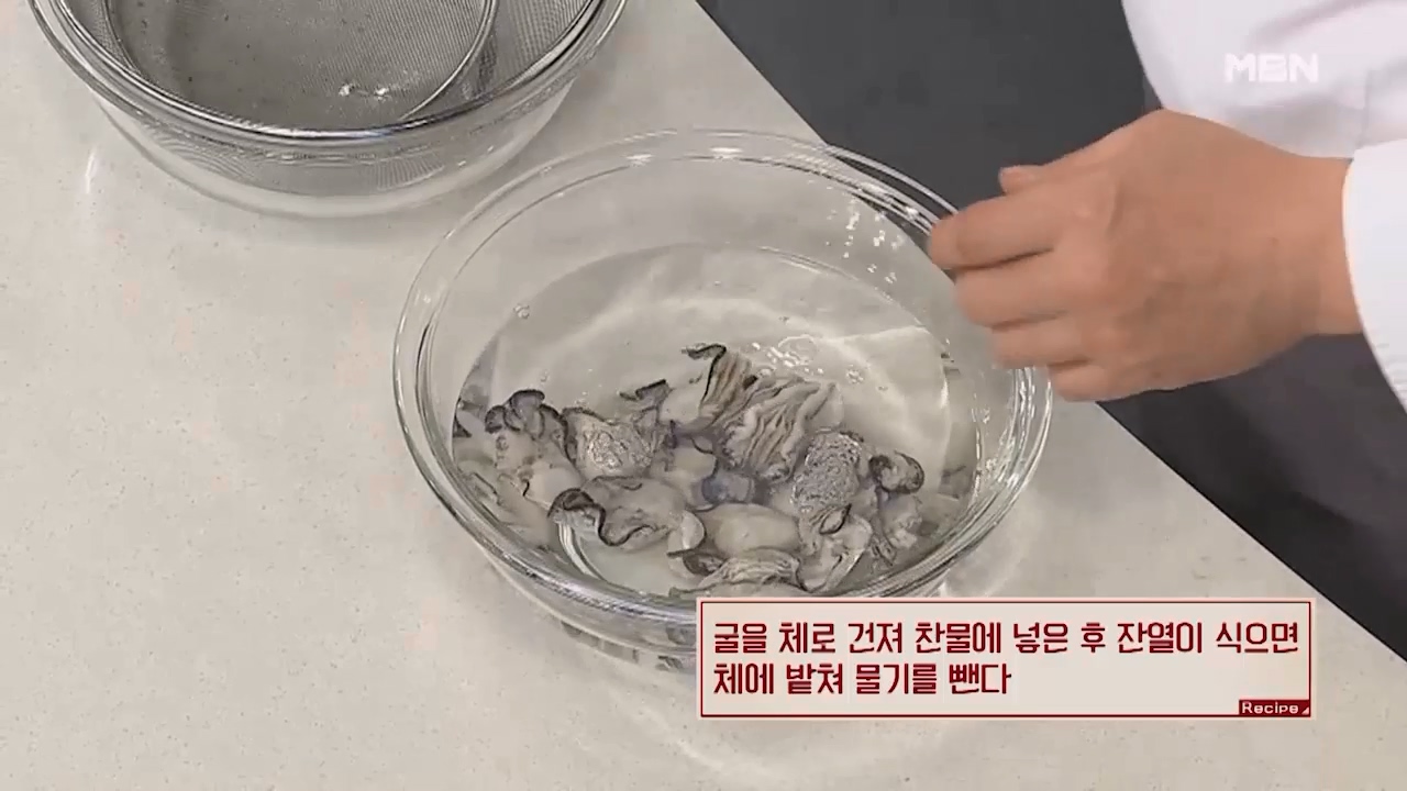 2. 굴을 체로 건져 찬물에 넣은 후 잔열이 식으면 체에 밭쳐 물기를 빼줍니다.