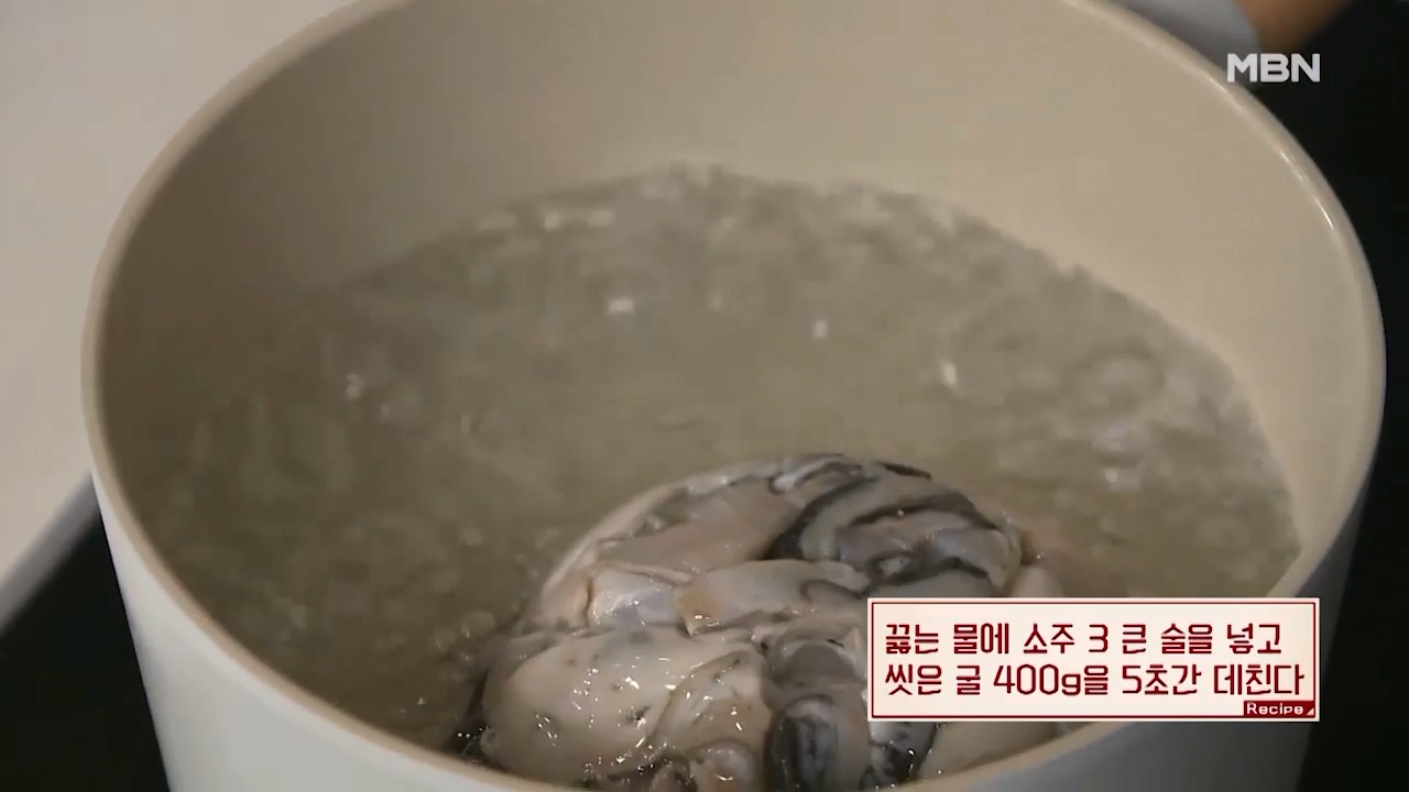1. 끓는 물에 소주 3큰술을 넣고 씻은 굴 400g을 5초간 데칩니다.