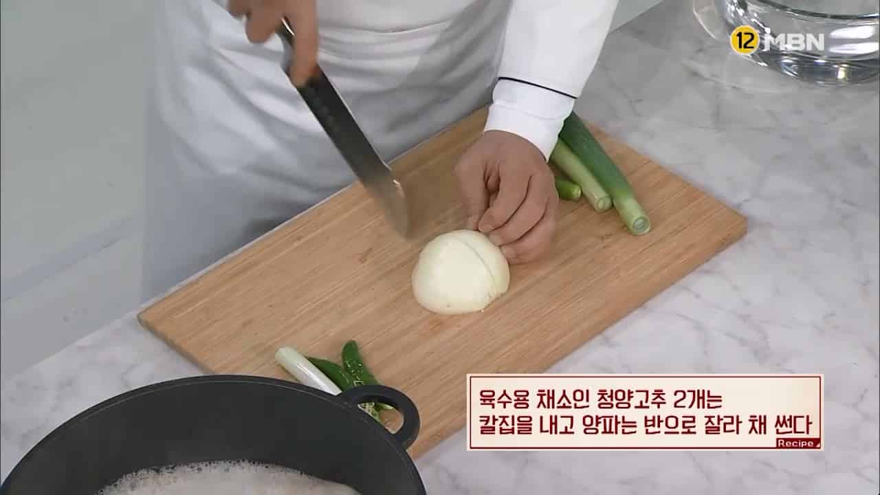 4. 육수용 채소인 청양고추 2개는 칼집을 내고 양파는 반으로 잘라 채썰어줍니다.
