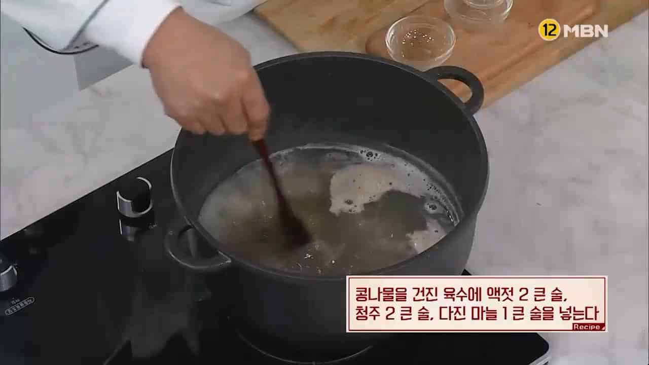 7. 콩나물을 건진 육수에 액젓 2큰술, 청주 2큰술, 다진마늘 1큰술을 넣습니다.