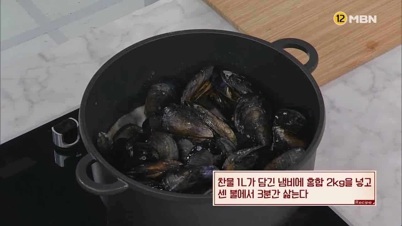 1. 냄비에 찬물 1리터를 붓고 홍합 2kg을 넣고 센불에서 3분간 삶아줍니다.