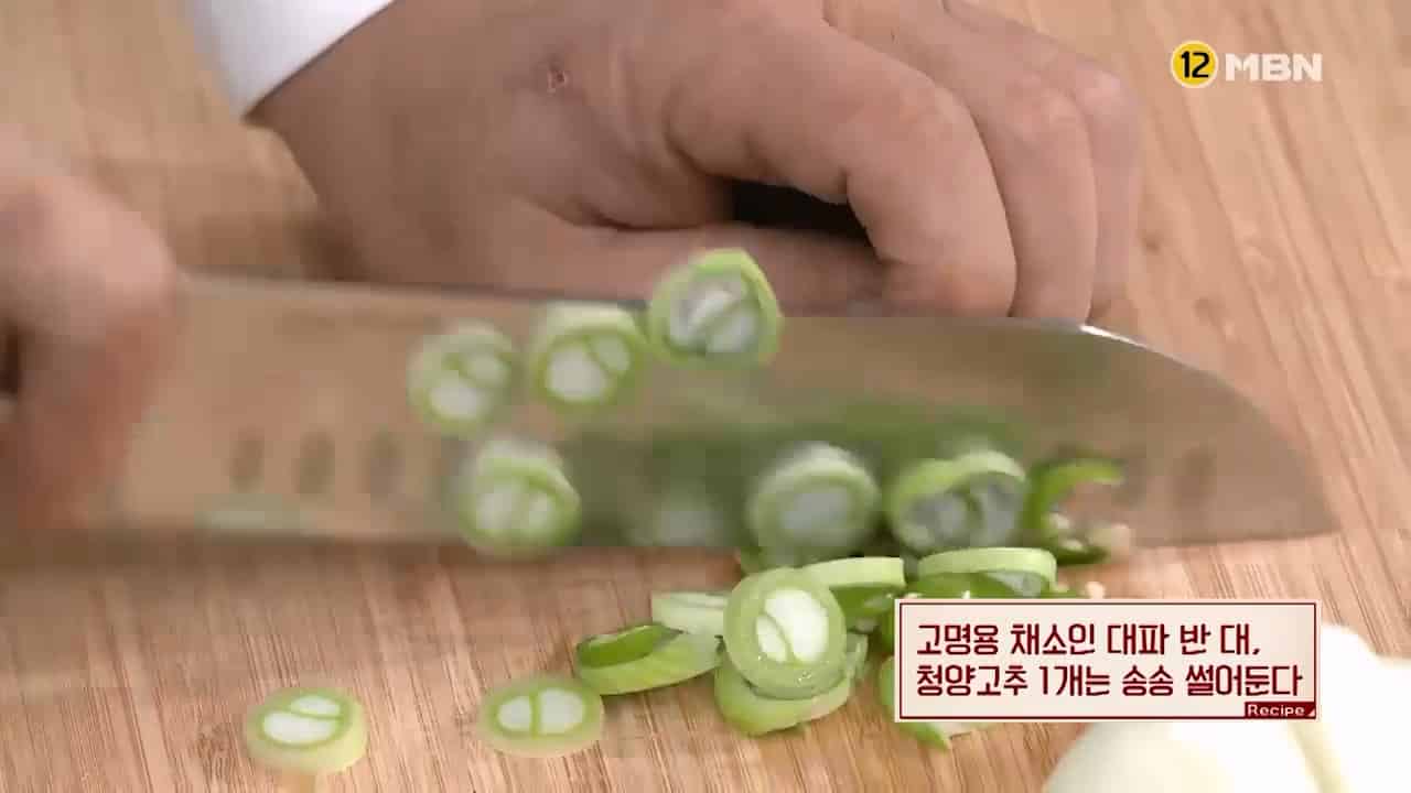 5. 고명용 채소인 대파 반대와 청양고추 1개는 송송 썰어 준비합니다.