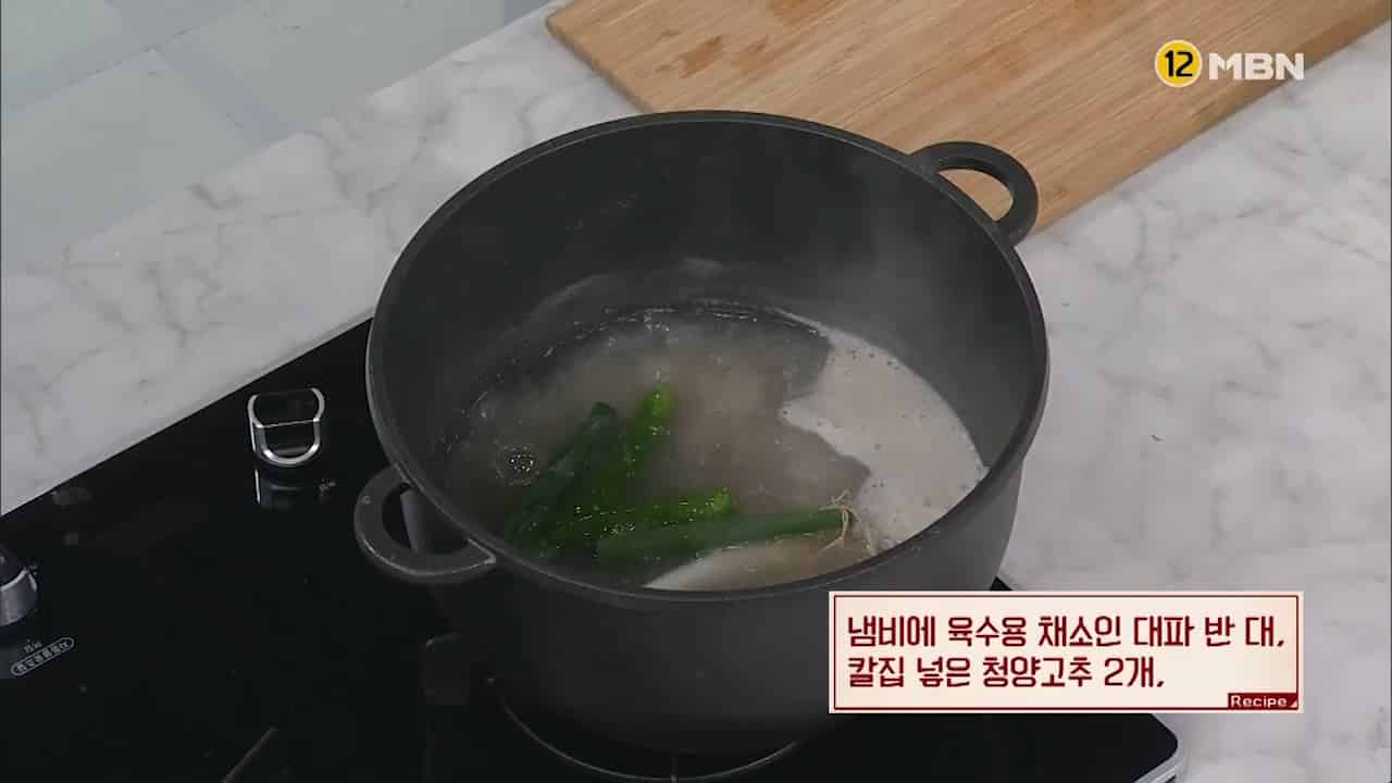 8. 냄비에 육수용 채소인 대파 반 대, 칼집 넣은 청양고추 2개, 채 썬 양파 반 개를 넣어 3분간 끓여줍니다.