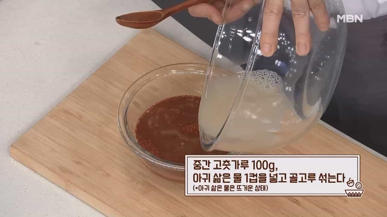 5. 중간 고춧가루 100g, 뜨거운 아귀 삶은물 1컵을 넣고 골고루 섞어줍니다.
