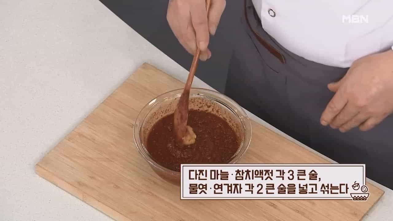 7. 다진 마늘 3큰술, 참치액젓 3큰술, 물엿 2큰술, 연겨자 2큰술을 넣고 잘 섞어 아귀찜 양념장을 만듭니다.