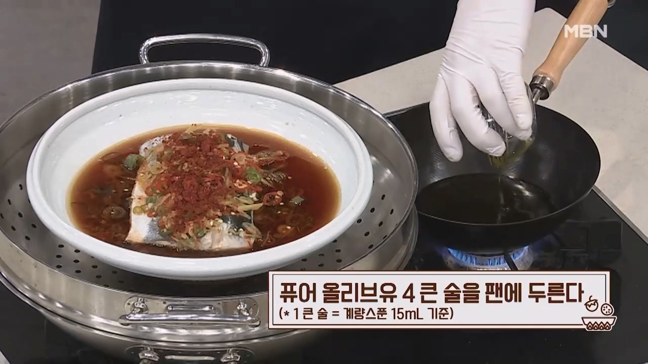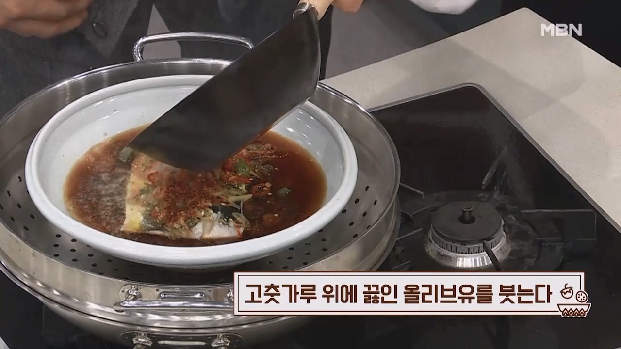 13. 고춧가루 위에 끓인 올리브유를 부어주면 맛있는 국물 삼치찜이 완성됩니다.