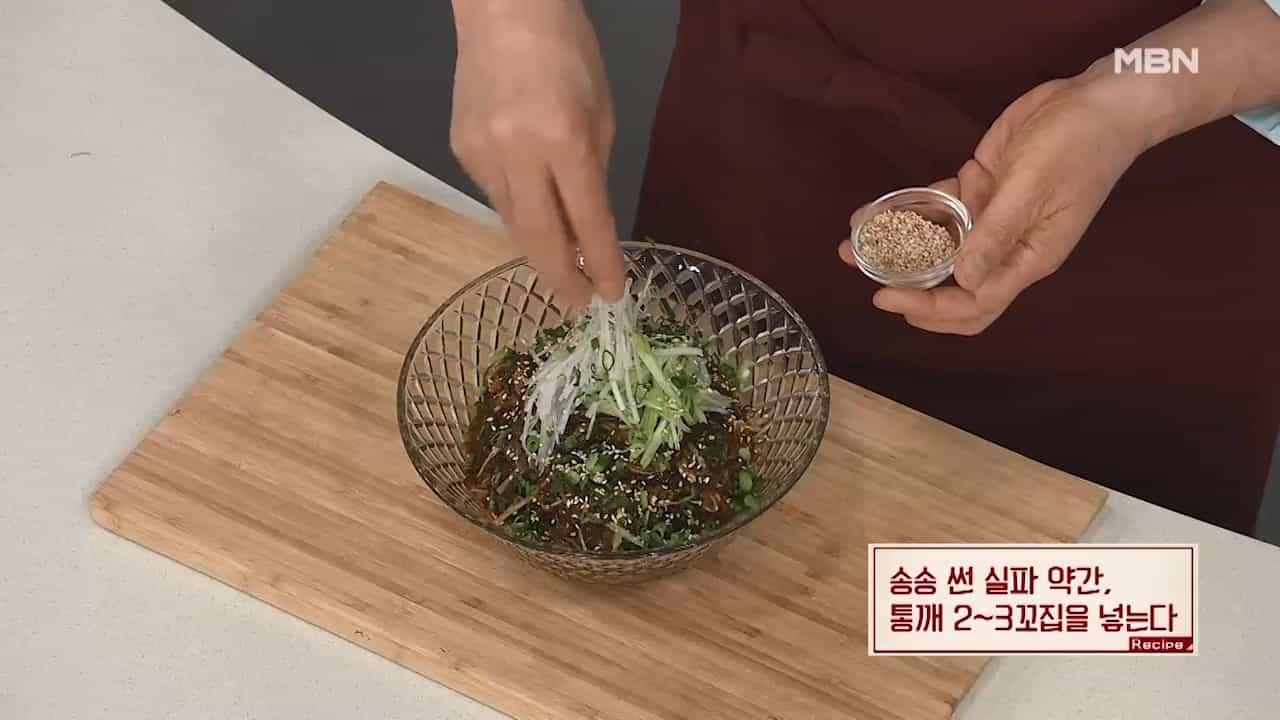 9. 꼬시래기 무침위에 송송 썬 실파 약간과 통깨 2~3꼬집을 뿌려주면 꼬시래기 무침이 완성됩니다.