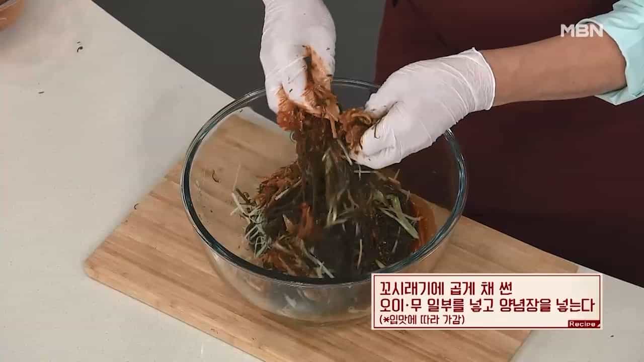 7. 꼬시래기에 곱게 채 썬 오이와 무 일부를 넣고 양념장을 넣어 잘 무쳐줍니다. (입맛에 따라 가감)