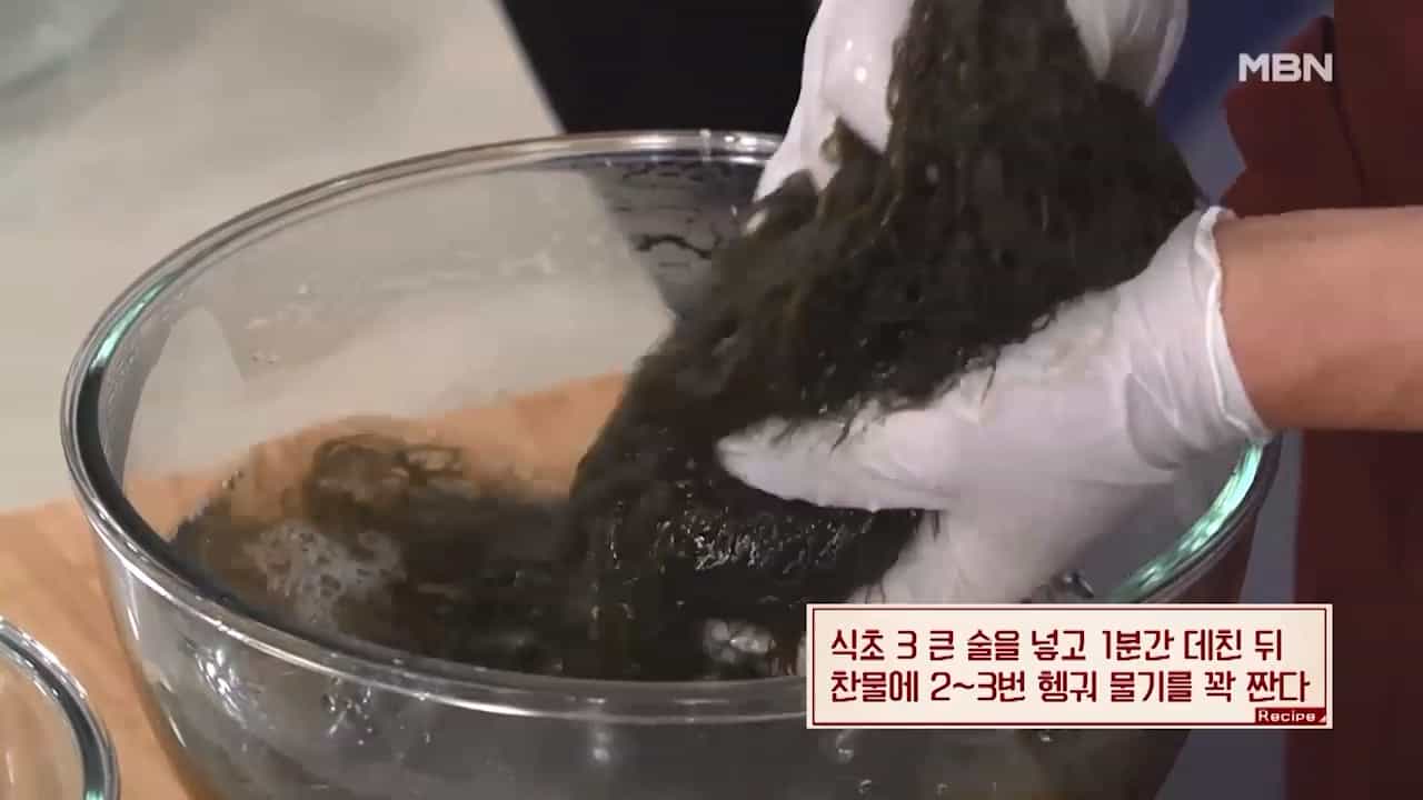 2. 식초 3큰술을 넣고 1분간 꼬시래기를 데친 뒤 찬물에 데친 꼬시래기를 2~3번 헹궈 물기를 꽉 짭니다.
