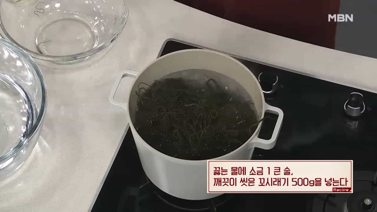 1. 끓는 물에 소금 1큰술, 깨끗이 씻은 꼬시래기 500g을 넣습니다.