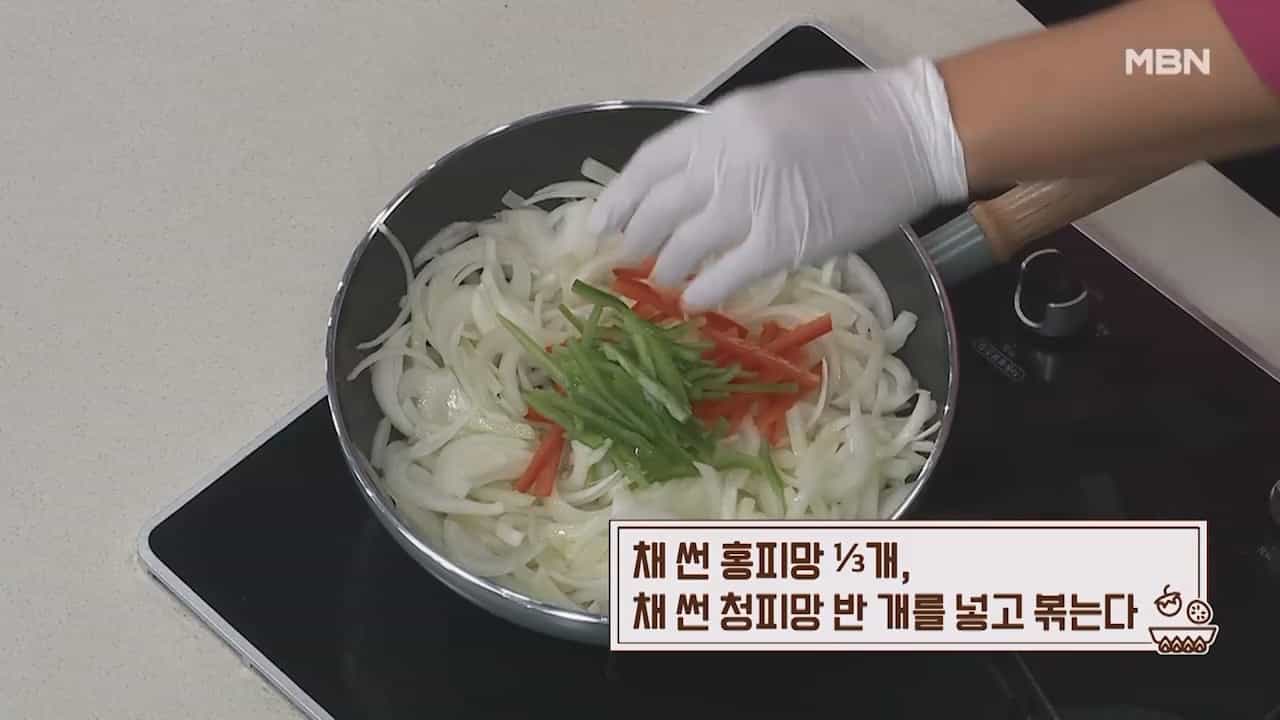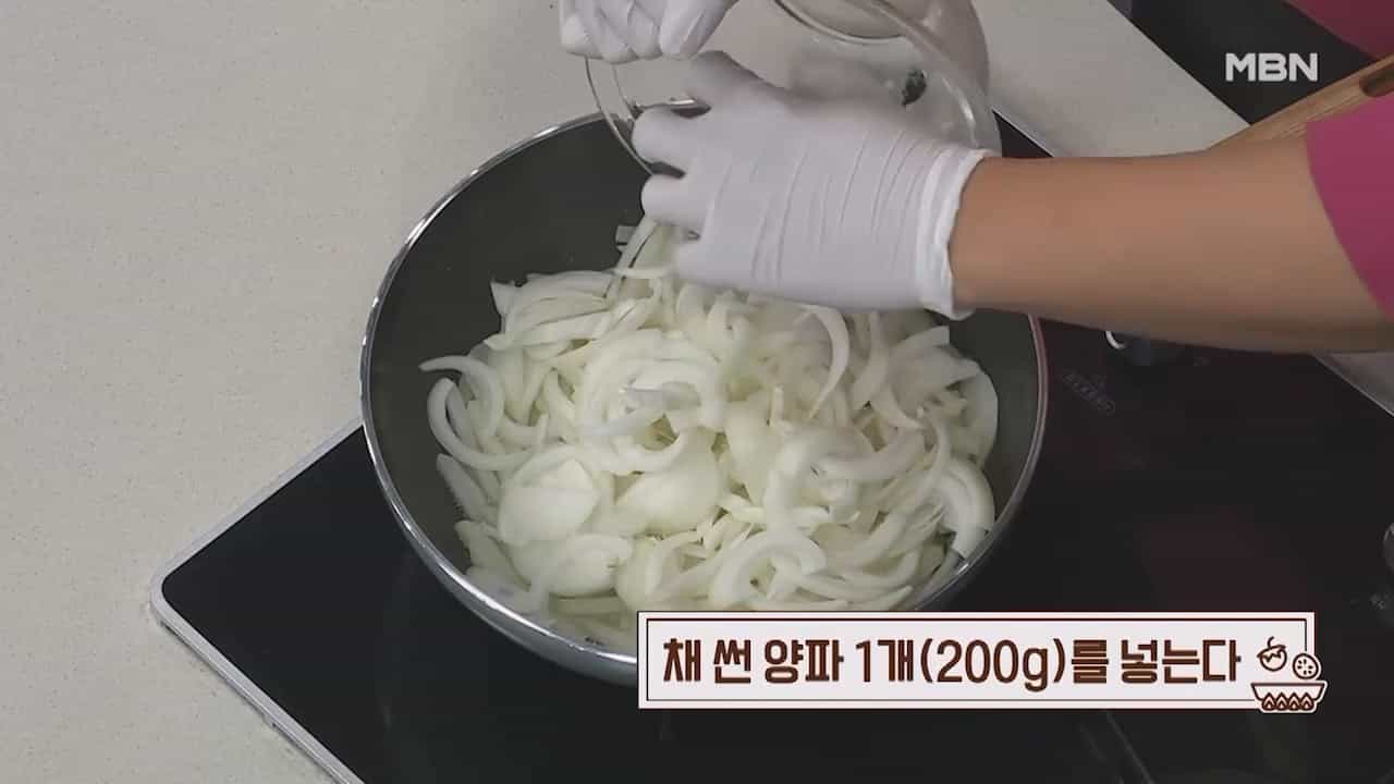 7. 채 썬 양파 1개(200g)를 넣습니다.