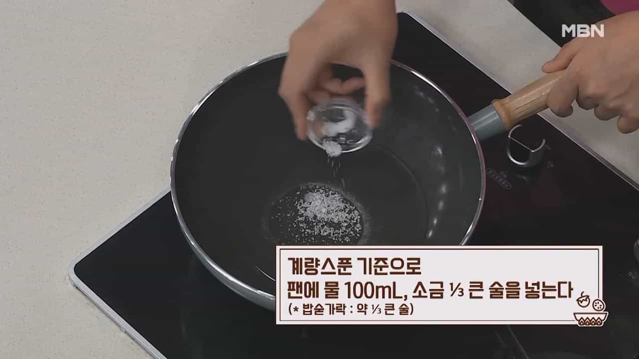 2. 계량스푼 기준으로 팬에 물 100mL, 소금 1/3큰술을 넣습니다. (밥숟가락 약 1/3큰술)