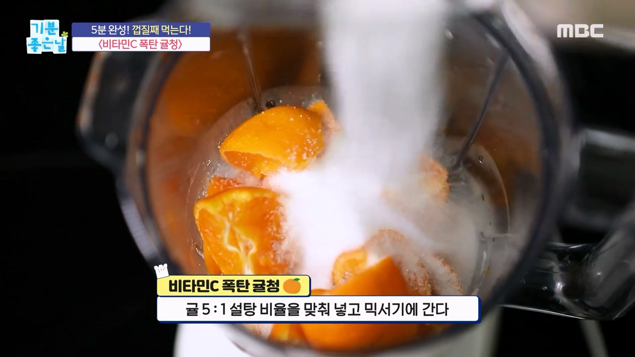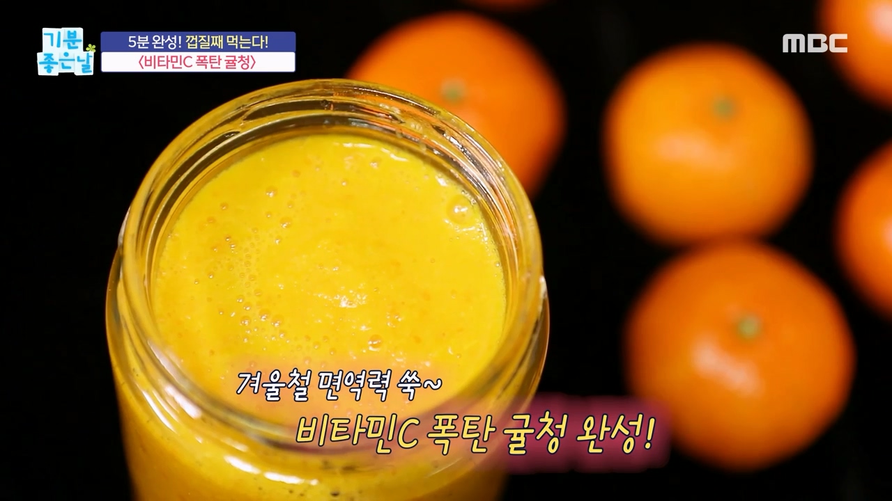 mbc 기분좋은날에서 알려준 감기에 좋은 귤청차 만드는법 알아보겠습니다. 귤에는 비타민C가 풍부해서 감기 예방에 도움을 주는 과일입니다. 그런데 귤 껍질에도 건강에 좋은 성분이 풍부한데 특히 리모넨이라는 성분이 풍부해 항산화 작용 및 염증 억제에 도움을 준다고 합니다. 껍질째 갈아서 마시는 귤청차 만드는법 알아보시고 겨울 감기 예방과 면역력 챙기세요.