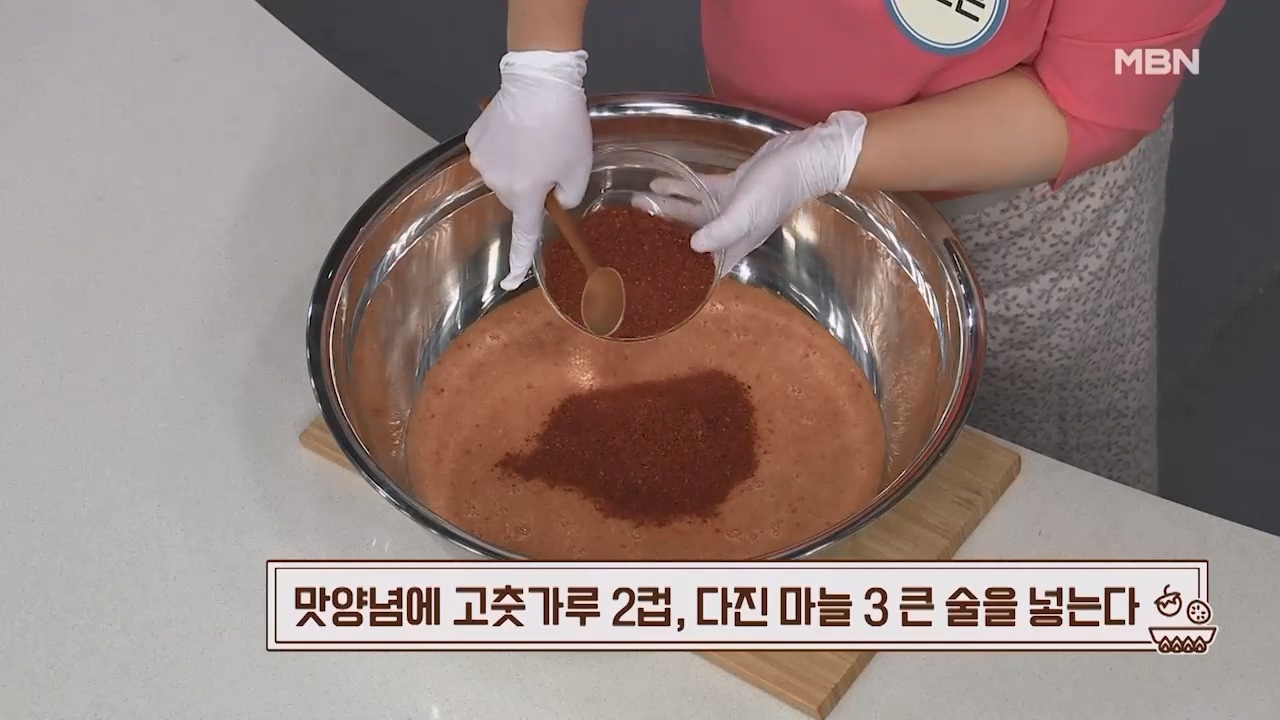 9. 맛양념에 고춧가루 2컵, 다진마늘 3큰술을 넣습니다.