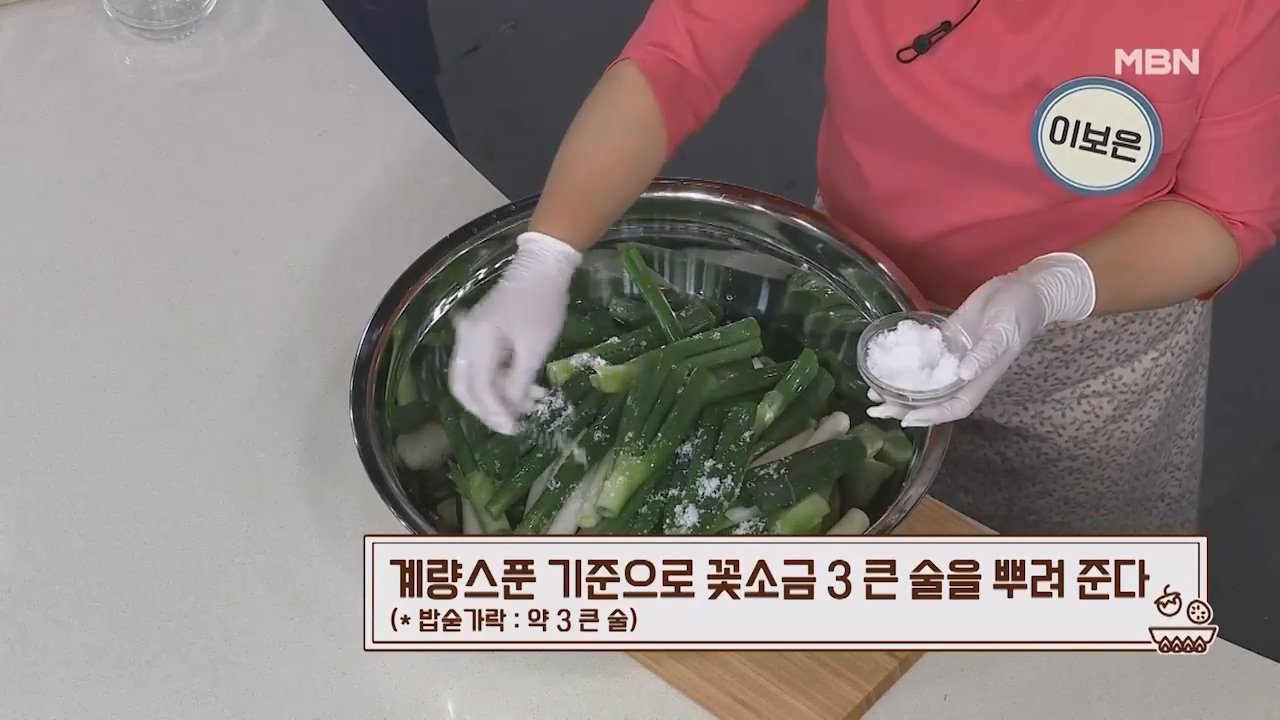5. 계량스푼 기준으로 꽃소금 3큰술을 뿌려서 대파를 절입니다. (밥숟가락 약 3큰술)