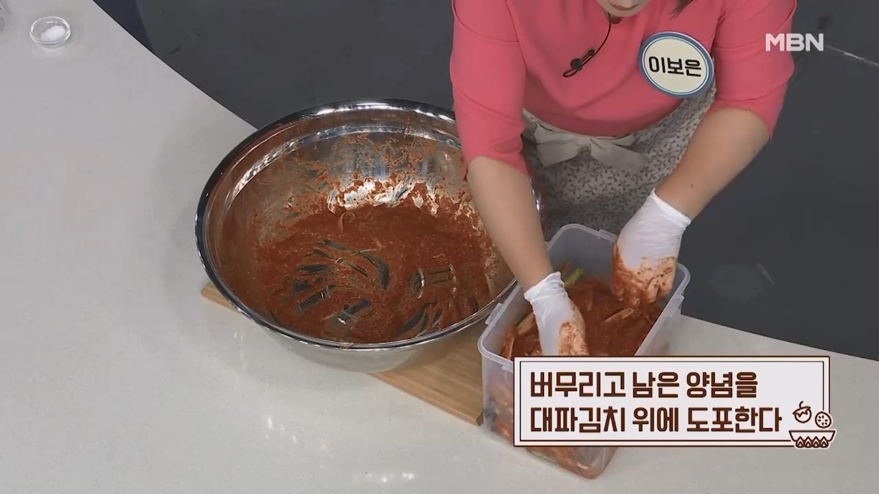 12. 버무리고 남은 양념을 대파김치 위에 도포하면 맛있는 대파김치가 완성됩니다.