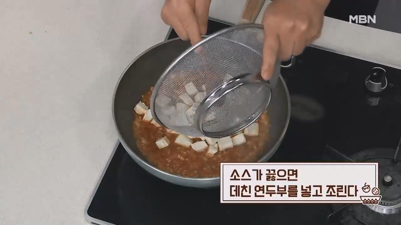 15. 소스가 끓으면 데친 연두부를 넣고 조려줍니다.
