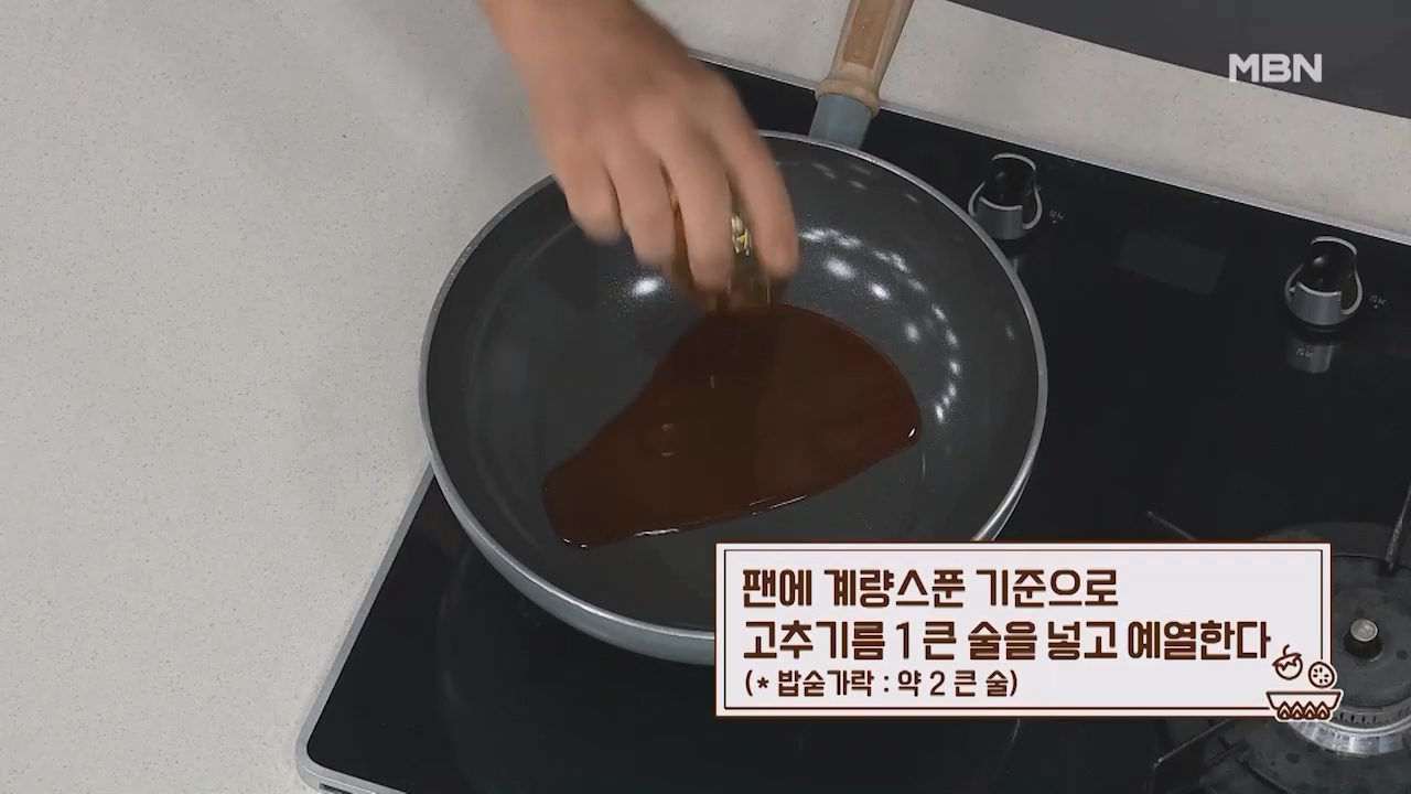 8. 팬에 계량스푼 기준으로 고추기름 1큰술을 넣고 예열을 합니다. (밥숟가락 약 2큰술)