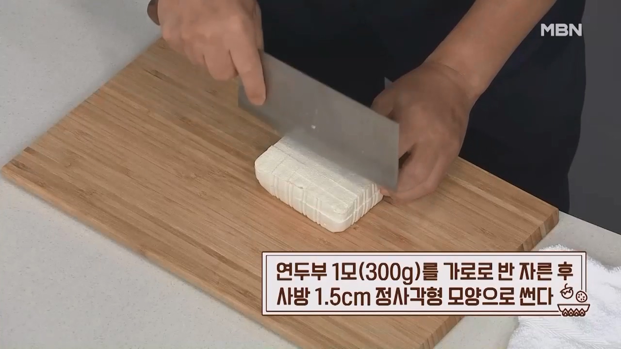 5. 연두부 1모(300g)를 가로로 반 자른 후 사방 1.5cm 정사각형 모양으로 썰어줍니다.