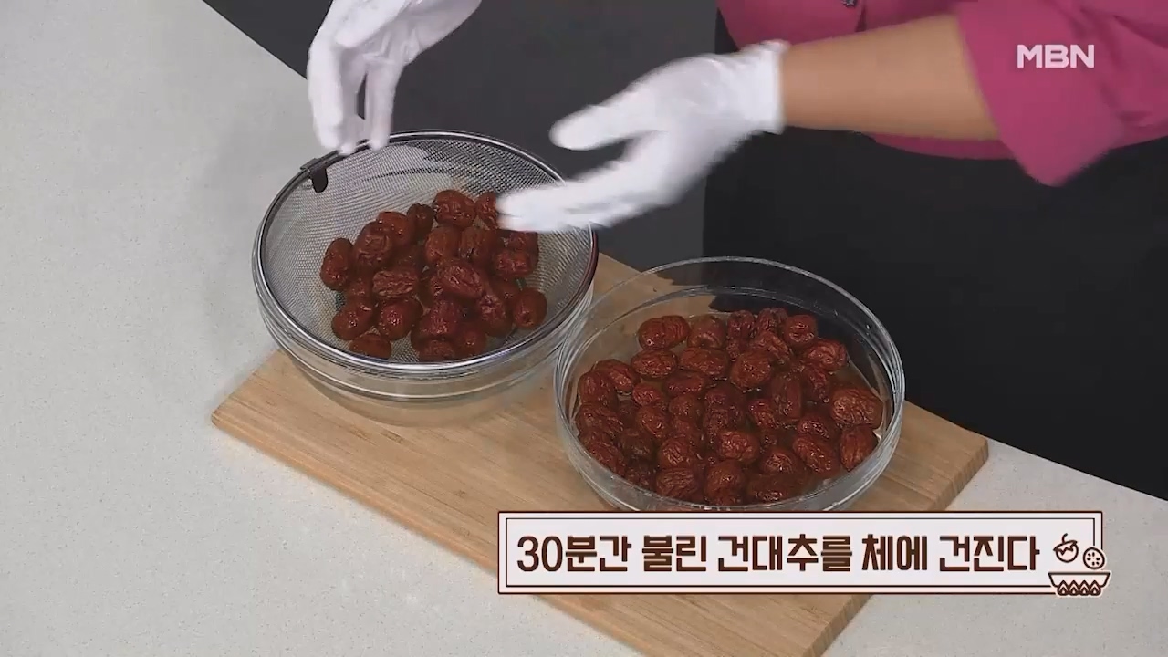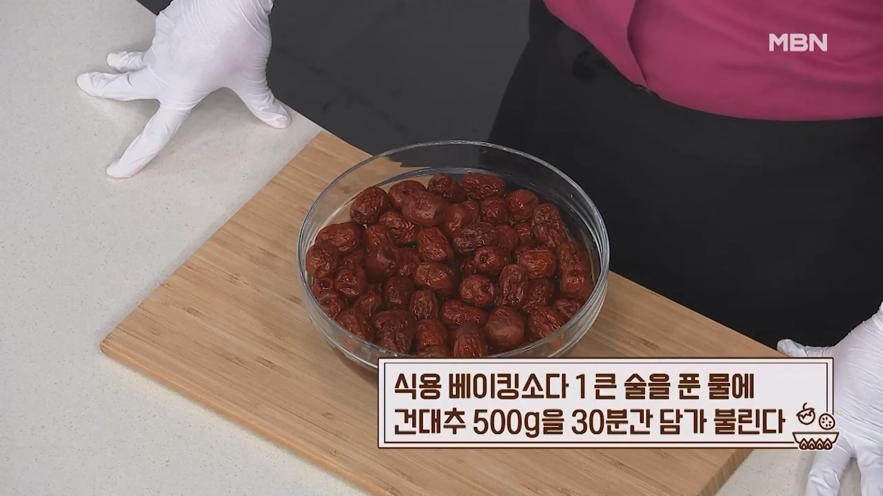 1. 식용 베이킹소다 1큰술을 푼 물에 건대추 500g을 30분간 담가 불립니다.