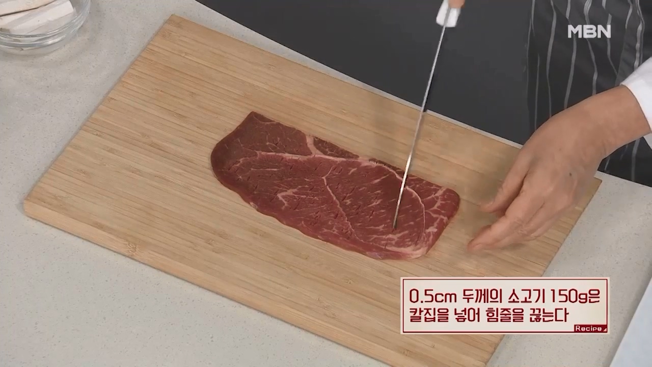 1. 0.5cm 두께의 소고기 150g에 칼집을 넣어 힘줄을 끊어줍니다.