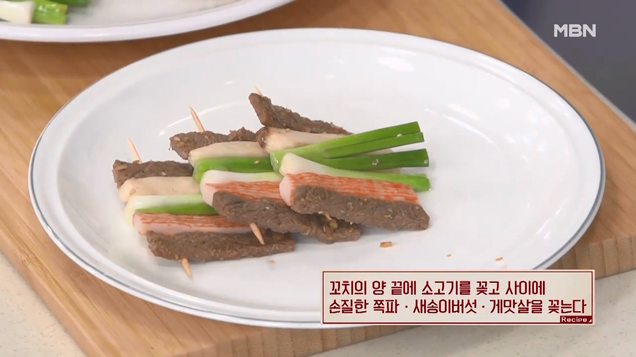 10. 꼬치의 양 끝에 소고기를 꽂고 사이에 손질한 쪽파, 새송이버섯, 게맛살을 꽂아줍니다.