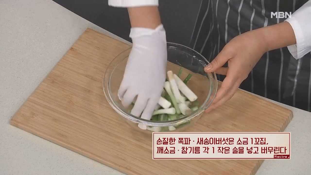 7. 손질한 쪽파와 새송이버섯은 소금 1꼬집, 깨소금 1작은술, 참기름 1작은술을 넣고 버무립니다.